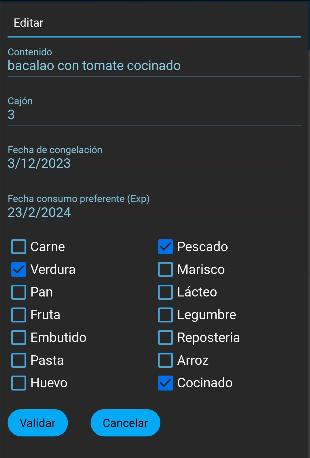 Si pulsas en la línea de información de el producto, se abrirá una ventana de edición con toda la información del producto, incluyendo la fecha de consumo preferente y la asignación del tipo que es (dicha asignación es usada por Alexa para las búsquedas por tipo de producto).
