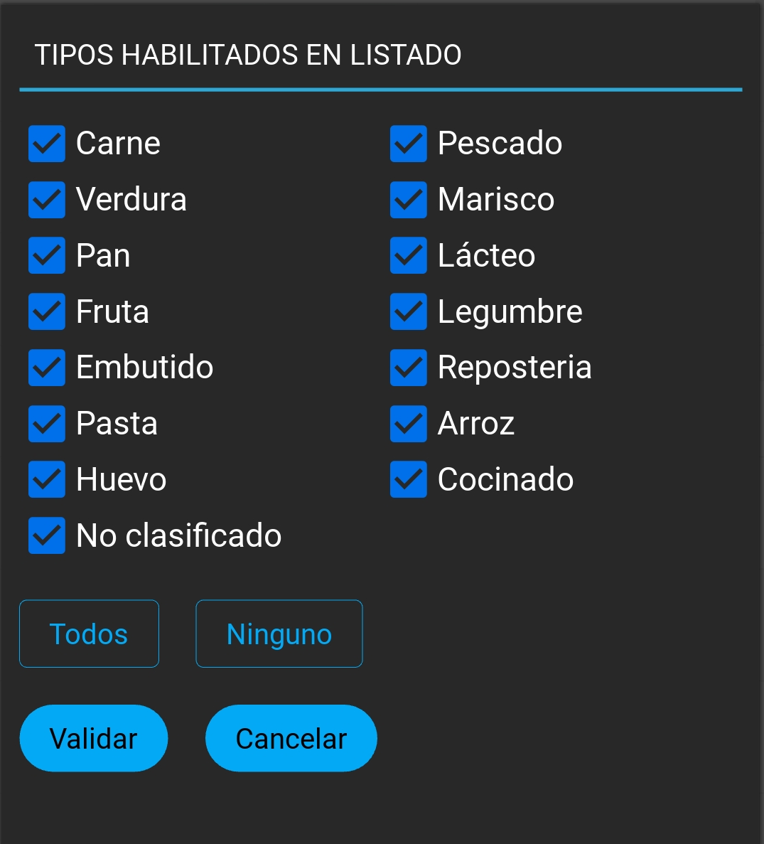 Los tipos marcados serán los que aparezcan en el listado, al abrir la aplicación todos los tipos están marcados por defecto.