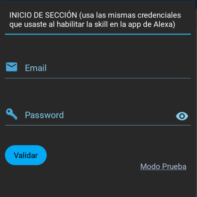 Al abrirla por primera vez, te pedirá que introduzcas las credenciales que usaste para registrar la Skill en Alexa. Este es un proceso que tendrás que hacer sólo la primera vez, o si sales del registro por alguna razón.