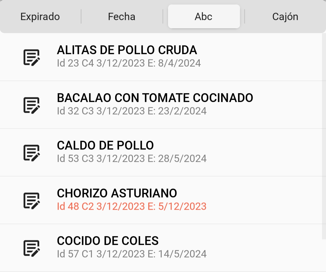Con los botones de la barra, justo encima del listado, podrás seleccionar entre varios criterios de ordenación de la lista: Por fecha ascendente de consumo preferente (Expirado), fecha de guardado (Fecha), orden alfabético del nombre de producto (Abc), y cajón en que etán guardados (Cajón).